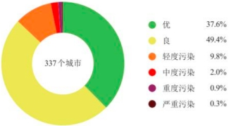 1)环境空气在线监测领域:根据《2020年中国生态环境状况公报》,2020年全国337个地级及以上城市(以下简称“337城市”)中,有202个城市环境空气质量达标,占全部城市数的59.9%,比2019年上升13.3个百分点;135个城市环境空气质量超标,占40.1%。337城市发生重度污染1152天次、严重污染345天次,以PM2.5为首要污染物的天数占重度及以上污染天数的77.7%,以PM10为首要污染物的占22.0%,以O3为首要污染物的占1.5%。
